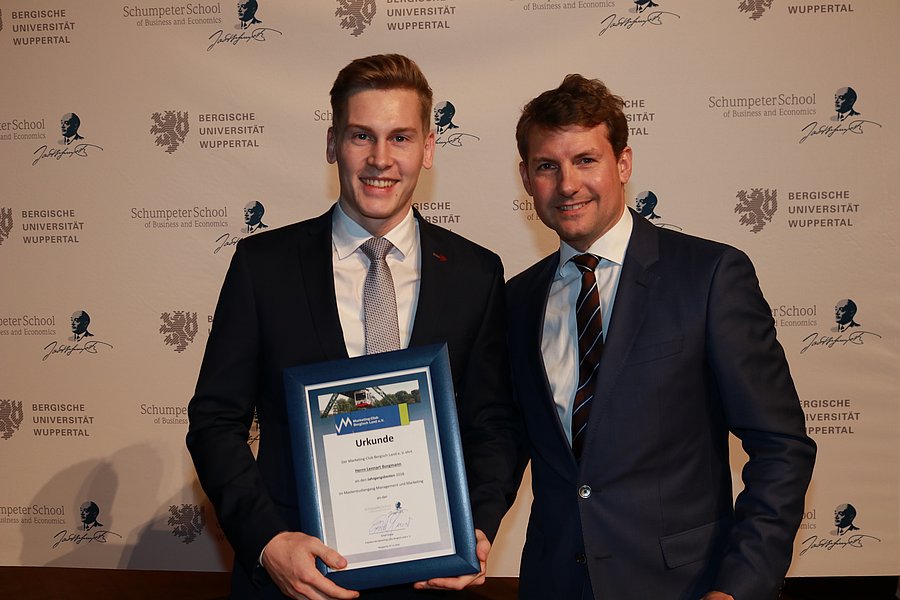 Als Jahrgangsbesten des Absolventenjahrgangs 2018 im Masterstudiengang Management und Marketing zeichnete der Marketing-Club Bergisch Land Herrn Lennart Borgmann, wissenschaftlicher Mitarbeiter und Doktorand am Lehrstuhl für Marketing, für seine hervorragenden Leistungen im Rahmens des Studiums aus. Die feierliche Urkundenübergabe erfolgte durch den Dekan der Schumpeter School of Business and Economics, Herrn Prof. Dr. Nils Crasselt, im Rahmen der Absolventenfeier der Bergischen Universität Wuppertal am 10. November in der Historischen Stadthalle Wuppertal.