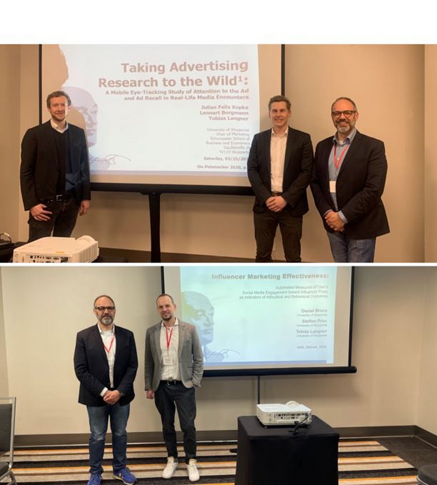 Julian Felix Kopka, Lennart Borgmann und Tobias Langner (Taking Advertising Research into the Wild: A Mobile Eye-Tracking Study of Attention to the Ad and Ad Recall in Real-Life Media Encounters) sowie Daniel Bruns, Steffen Prior und Tobias Langner (Influencer Marketing Effectiveness: Automated Measures of User’s Social Media Engagement toward Influencer Posts as Indicators of Attitudinal and Behavioral Outcomes) haben auf der diesjährigen Konferenz der American Academy of Advertising (AAA) in Denver ihre Forschungsbeiträge erfolgreich präsentiert.