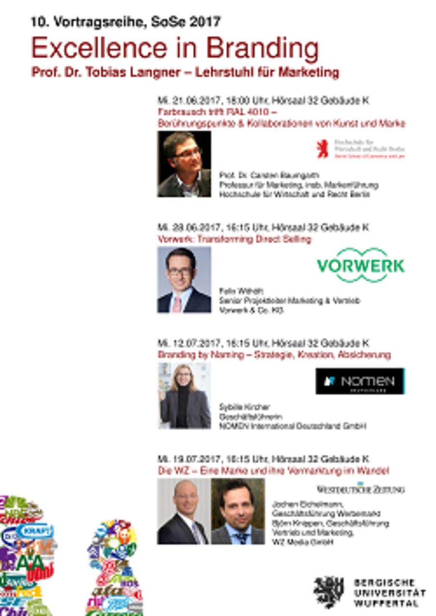 Bereits zum zehnten Mal veranstaltet der Lehrstuhl für Marketing der Schumpeter School unter der Leitung von Prof. Dr. Tobias Langner die öffentliche Vortragsreihe „Excellence in Branding“. Topmanager geben hier einzigartige Einblicke hinter die Kulissen starker Marken.