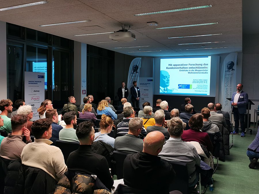 On Thursday 23 November, the Marketing Club Bergisch Land held its club evening at the Schumpeter School of Business and Economics at the University of Wuppertal. Professors Tobias Langner, Julian Felix Kopka and Lennart Borgmann took the guests of the club evening on an exciting journey into the world of modern marketing research. Participants were able to experience one of Europe's most modern brand laboratories up close and try out equipment-based research methods such as eye-tracking for themselves. The highlight of the club evening was the "Wuppertal Living Room Study". As one of the world's largest studies using mobile eye-tracking, it analyses evening media consumption in over 100 households. This provides unique insights into how we deal with media and advertising today.