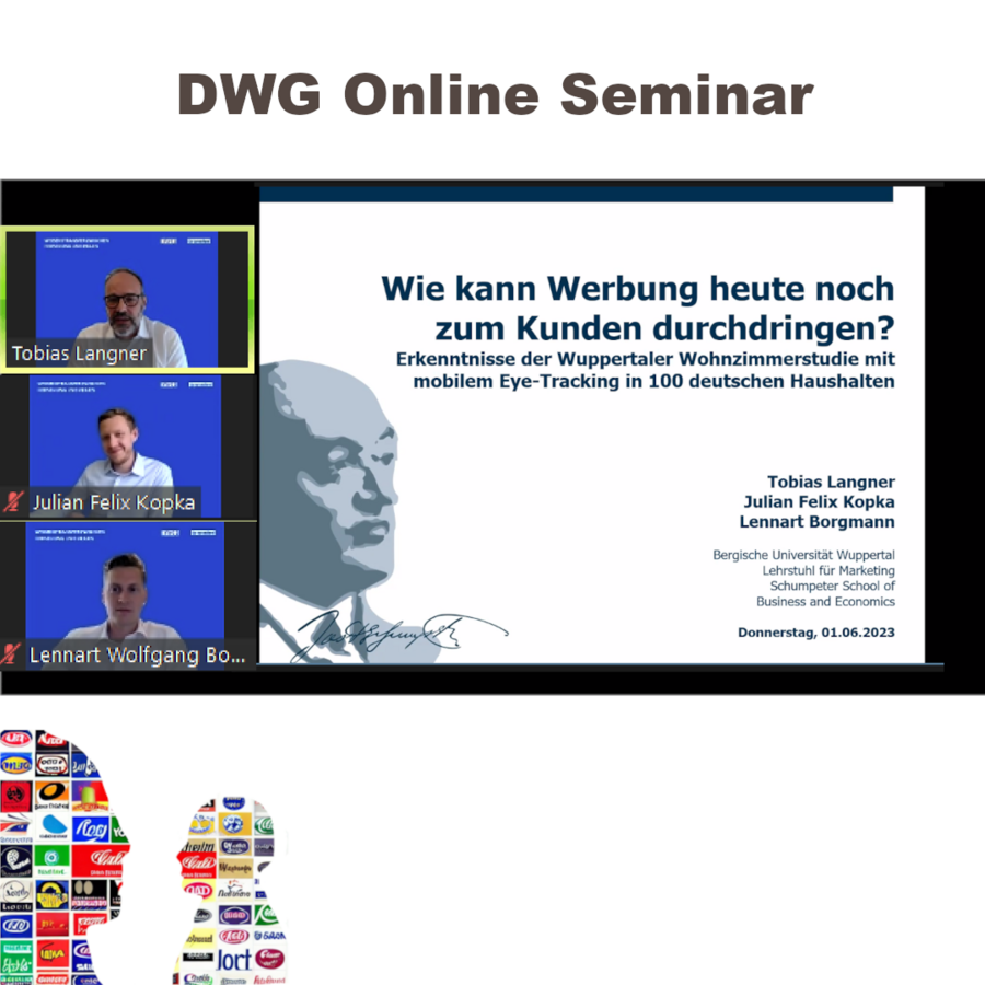 Prof. Dr Tobias Langner, Lennart Borgmann and Julian Felix Kopka held the DWG online seminar "How can advertising still reach customers today? Findings from the Wuppertal living room study with mobile eye-tracking in 100 German households". More than 40 experts from advertising practice, research and teaching took part in the seminar, which is organised by the German Advertising Research Association (DWG). With this series of events, the DWG promotes the transfer of scientific research into practice.