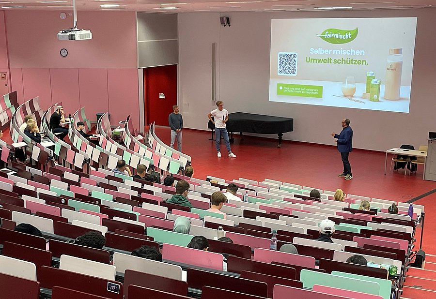 The two alumni of the University of Wuppertal gave an exciting presentation on the history of Fairmischt. The company has set itself the goal of making the consumption of plant-based milk more sustainable. By reducing transport routes and packaging waste, Fairmischt makes an important contribution to environmental protection. In addition to the product development of a delicious oat drink, the creation of a brand that communicates quickly was at the centre of the young start-up's first major marketing challenge.