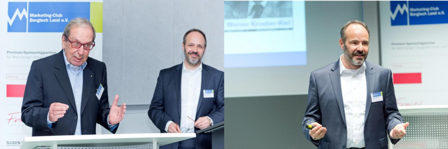 It was back to the future in midsummer temperatures for more than 60 guests and members of the Marketing Club Bergisch Land on the evening of 19 April at the University of Wuppertal. The event focussed on a journey through 70 years of marketing history. Honorary President Hartmut Happich hosted the evening, during which the speakers Dieter Lübcke, founder of the Bergisch Land Marketing Club, and Professor Langner, Chair of Marketing at the Bergisch Land University, presented the guests with an entertaining mix of current affairs, theory and practical knowledge with many examples and showed the developments in marketing from decade to decade. For example, important milestones such as the development of the marketing mix (the 4Ps: Price, Promotion, Place and Product), the BCG matrix or the founding of the first marketing chair, which still characterise marketing today.